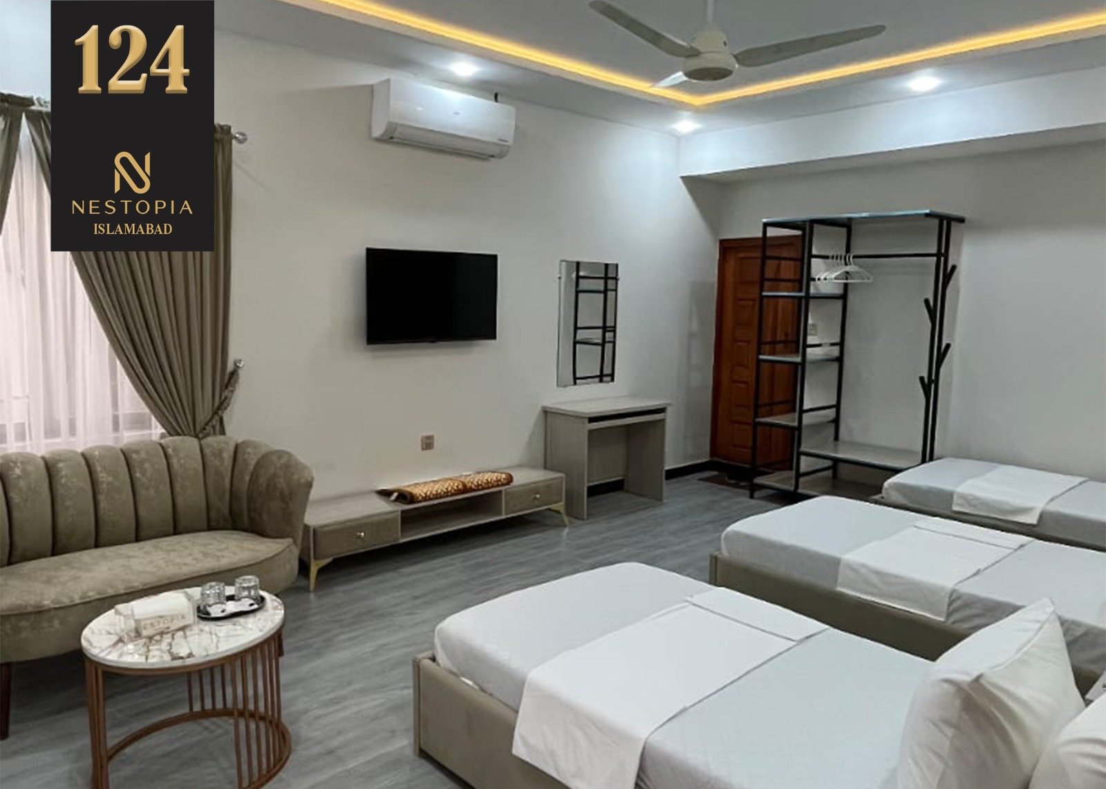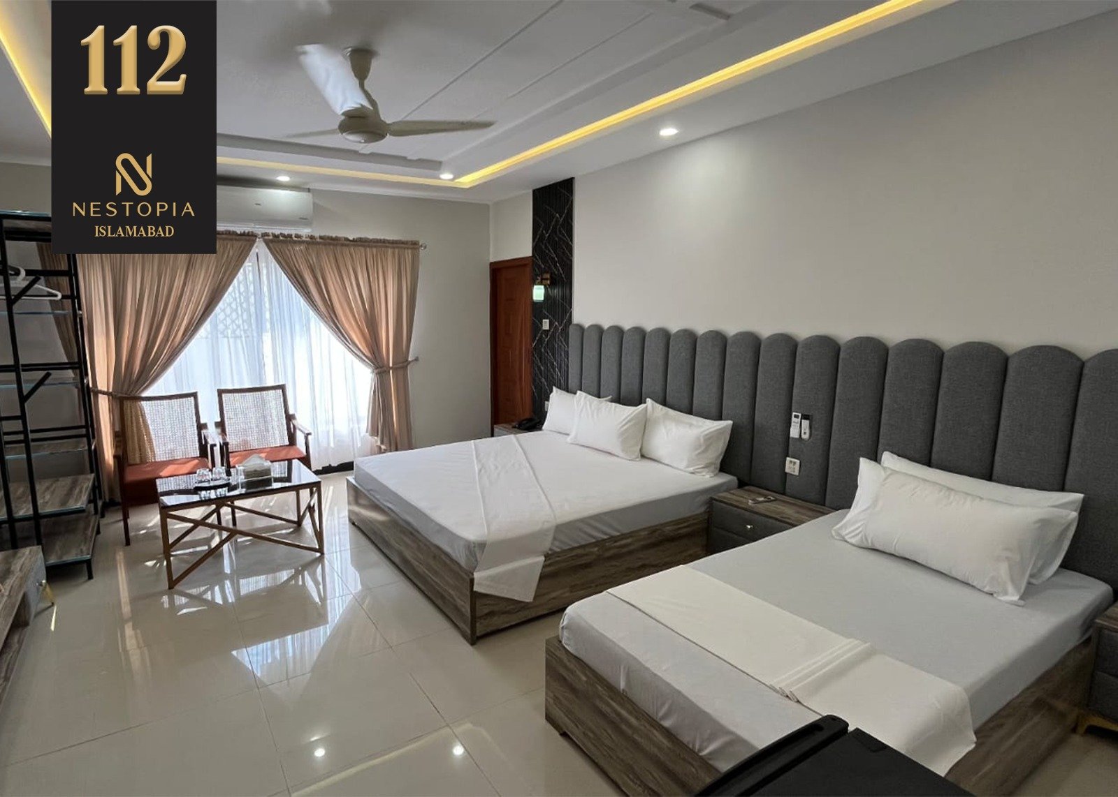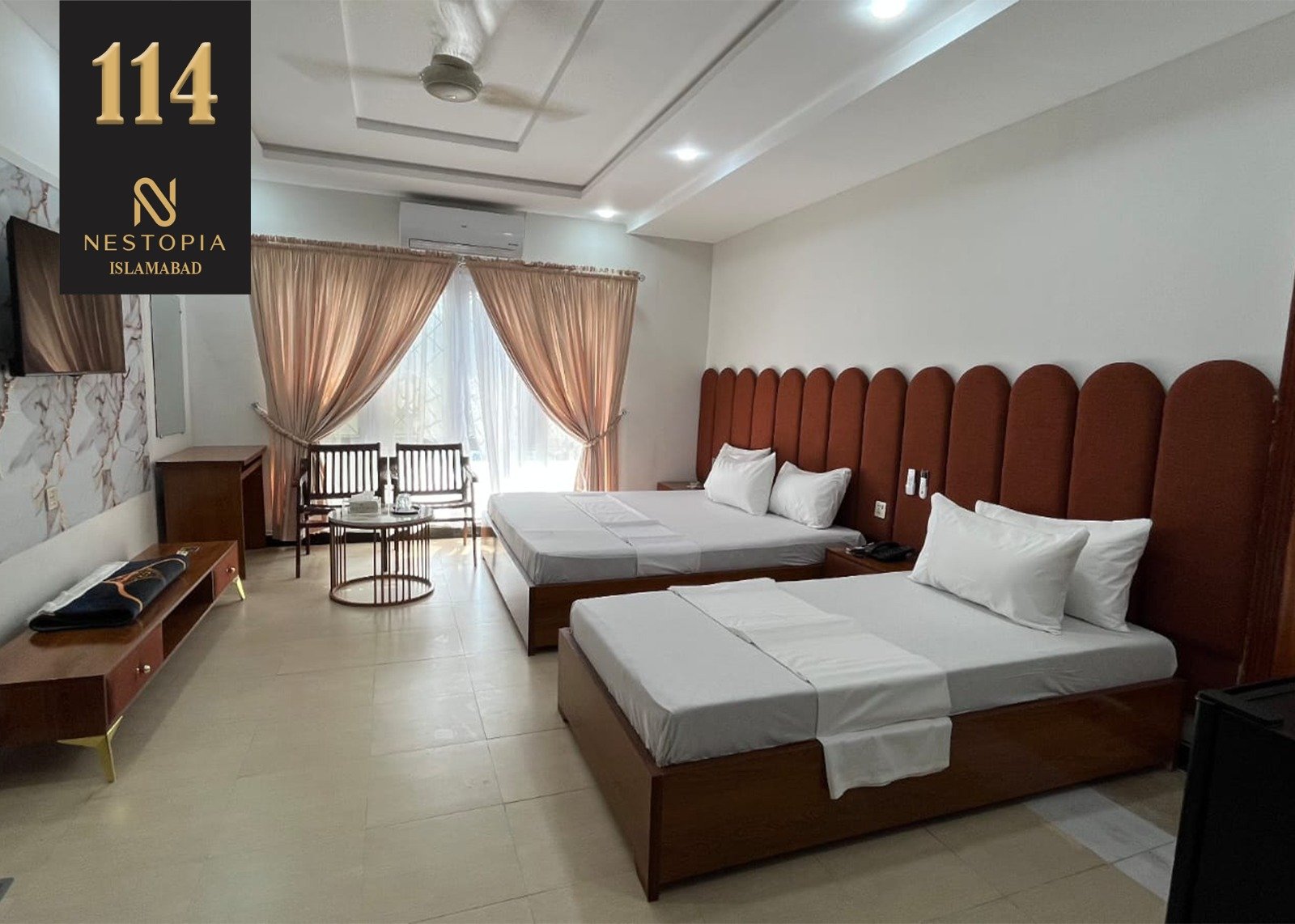 Nestopia Guest House Islamabad is a well-maintained 2-star bed & breakfast offering modern, comfortable rooms in the central area of G-6/3 Islamabad. Ideal for families, business travelers, and tourists, the guest house provides clean twin, double, triple, and family rooms along with complimentary breakfast, free Wi-Fi, secure parking, and daily housekeeping.